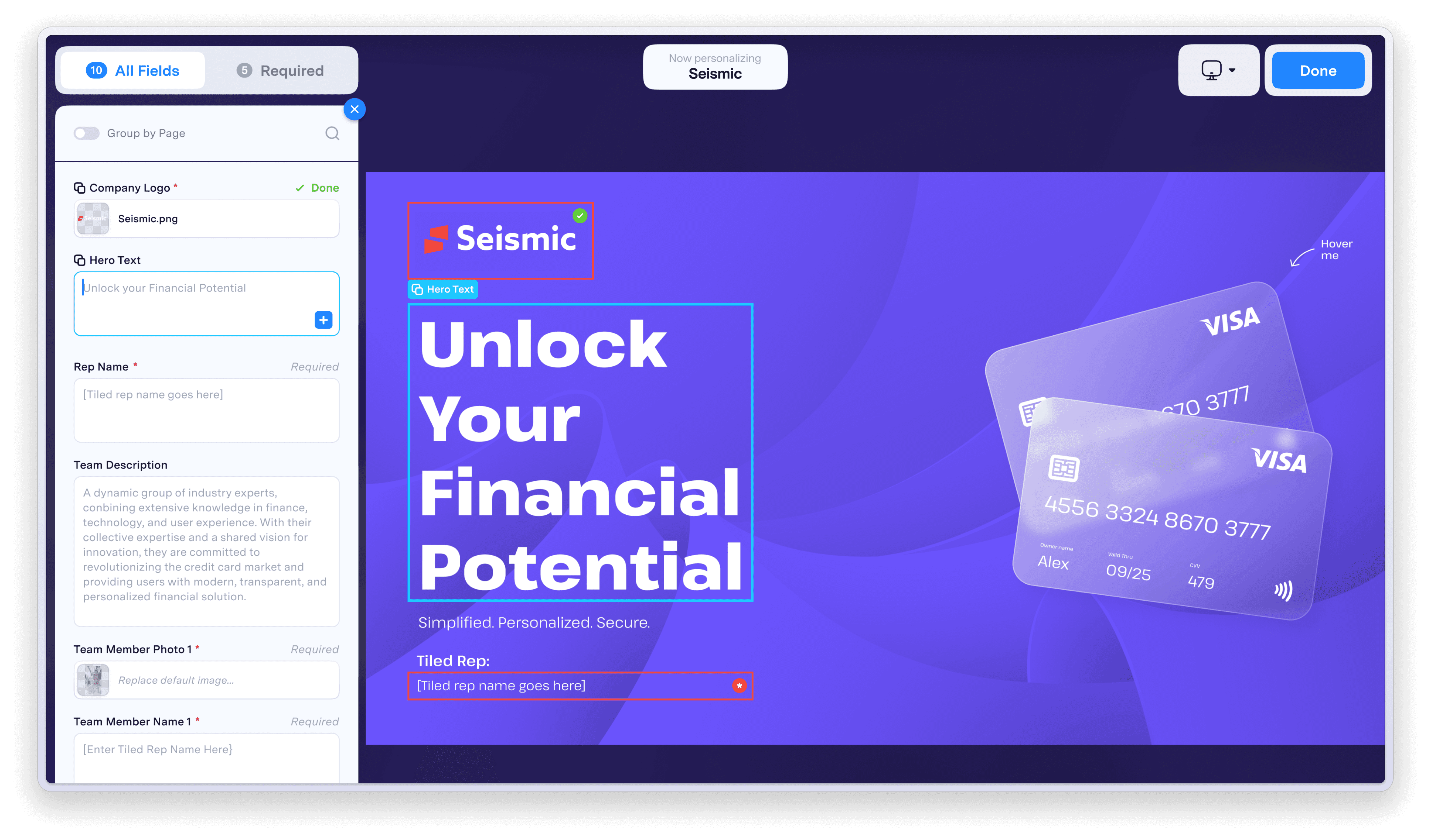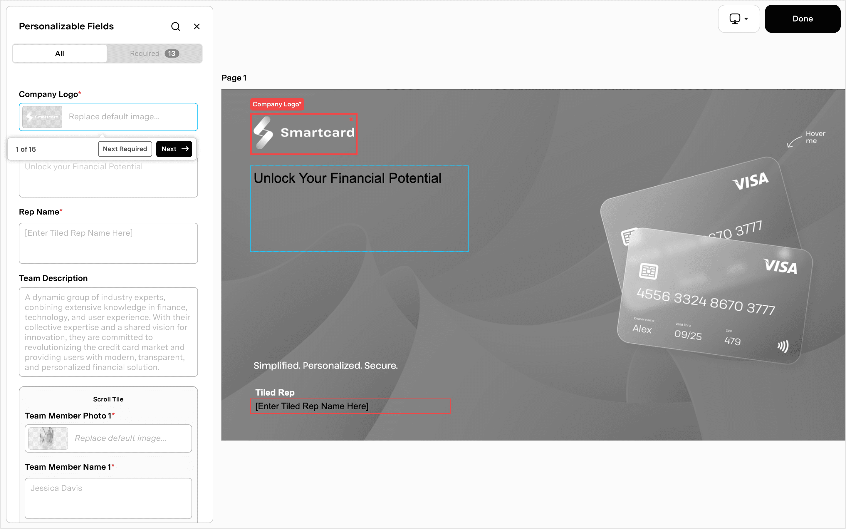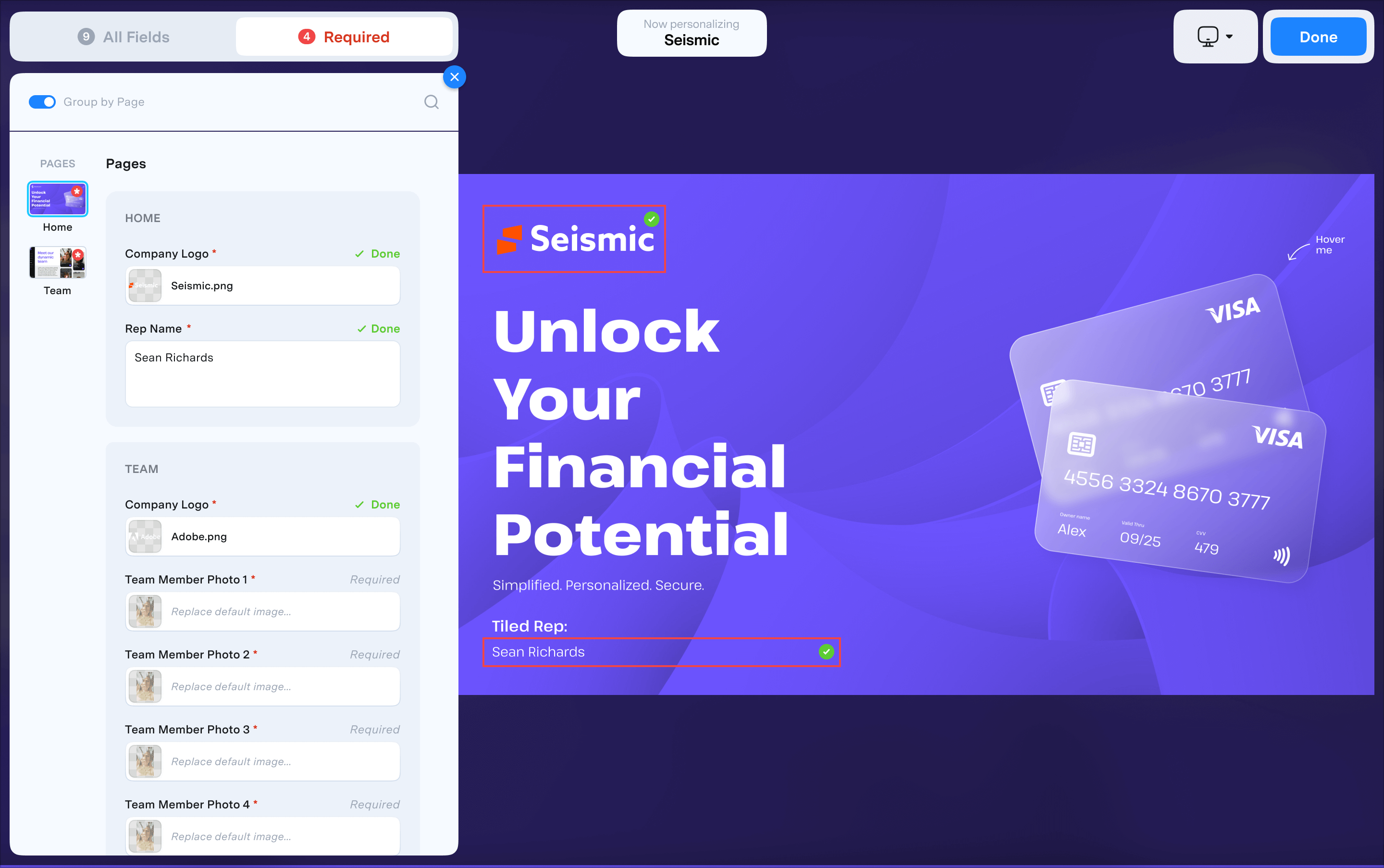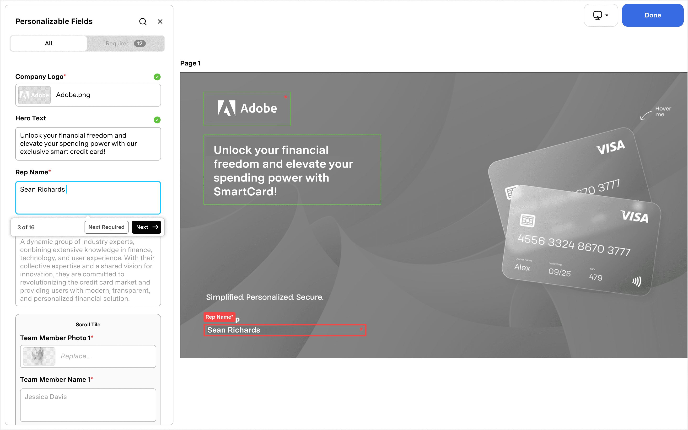 Any required field that has been modified by the user will be marked with a "Done" badge.
