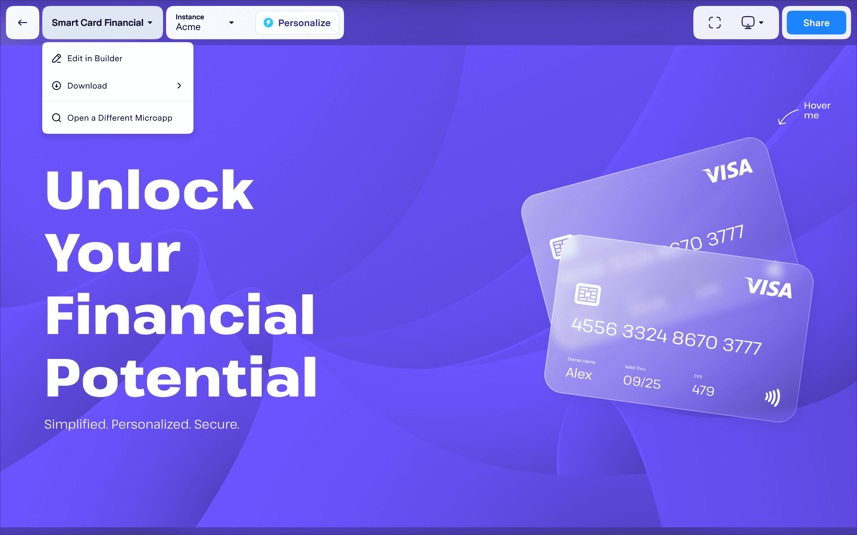 Microapp selection, instance management, and personalization controls all crammed into one menu.