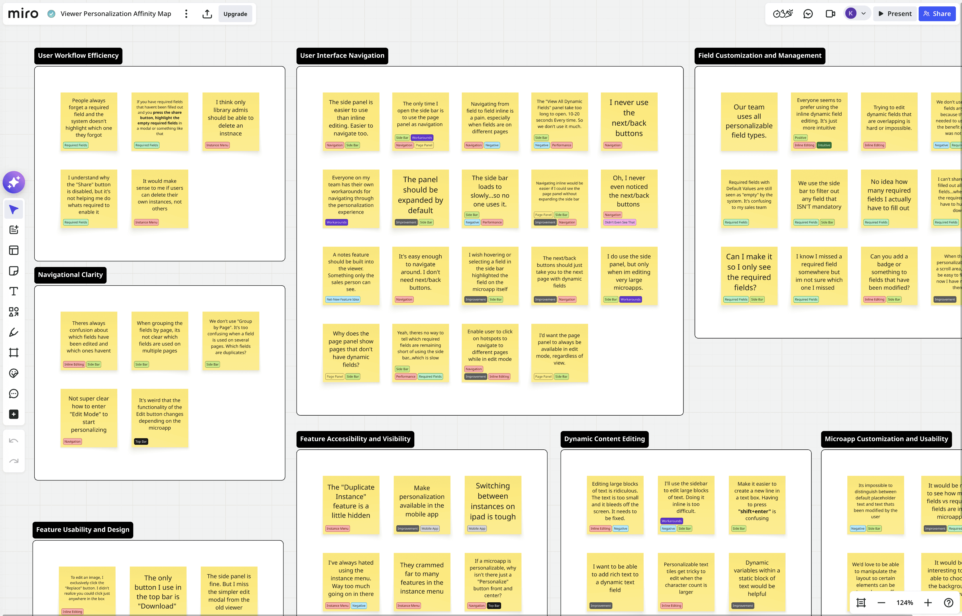 The interviews surfaced a lot of feedback. I organized everything in Miro, tagging each note by theme and sorting them into clusters.